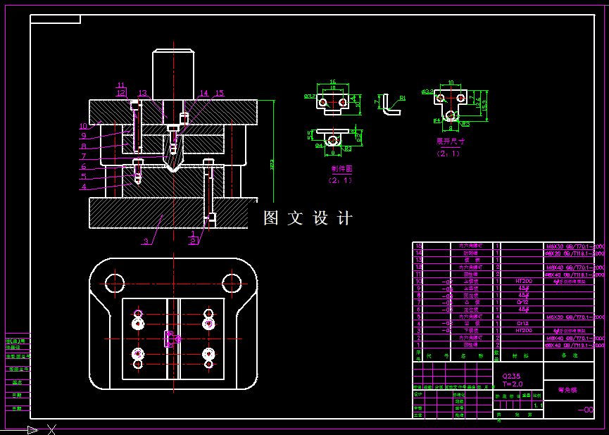 弯角弯曲模具设计,包括装配图,所有非标零件图。 冲裁材料为Q235,查文献[1] :普通碳素结构钢(GB699-88摘录),该材料属于低炭钢,屈服点σs=240MPa,抗拉强度σb=440-470MPa,抗剪强度=310-380MPa,延伸率不小于25%,塑性好,焊接性好,适合冲裁。