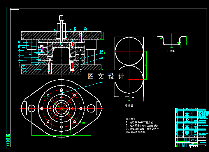 弹簧座首次落料拉伸倒装复合模具设计,包括装配图,凹模图。 冲裁件的精度主要以其尺寸精度、冲裁断面粗糙度、毛刺高度三个方面的指标来衡量,根据零件图上的尺寸标注及公差,可以判断属于尺寸精度为IT12—IT14的经济级普通冲压。08F钢板属于碳素结构钢,屈服极限为245MPa,具有很好的可冲裁性,工件结构形状冲裁件内,外形均无尖锐清角,对模具寿命不影响。