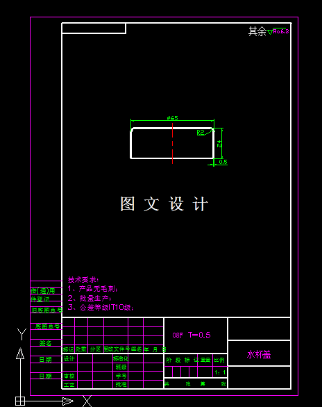 水杯盖落料拉伸复合模设计,包括装配图,非标零件图。 产品外形为筒形拉伸件,所以有落料,拉深2种工序。 ①落料—拉深,单工序模生产。 ②落料拉深工序复合,复合冲压生产。 ③落料—拉深—切边级进模,采用级进模生产。 方案②复合模结构一般,比较容易制造。节约了半成品搬运的时间提高了生产效率且易于保证孔的质量和制件精度。