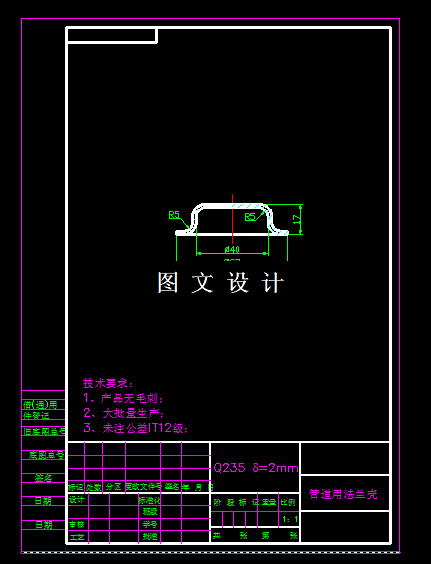 法兰壳落料拉伸倒装复合模设计,包括装配图,零件图,3D立体图。 根据零件形状确定冲压工序类型和选择工序顺序,冲压该零件需要的基本工序有落料、拉深。 由于将落料与拉深进行复合,工序少,生产效率较高,但模具结构较复杂,安装、调试难于控制。为了提高生产率,冲压件尺寸稳定、精度高,故在此设计中选择该方案进行冲制法兰壳。