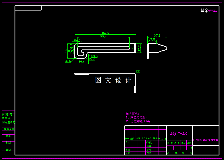 25兆电源滑槽支架冲孔模具设计,包括装配图,所有非标零件图。 产品公差比较大,该零件材料20#钢,料厚为2.0mm,因而从尺寸精度和材料方面分析比较适合用冲压加工。但孔的形状比较怪异,尺寸适中,由于考虑到模具结构的复杂,加工方便,所以建议这个冲孔模可以单独加工。