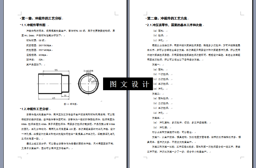 套筒悬臂式冲孔模具设计,装配图,非标准件零件图,3D立体图。 由冲裁件零件图可知,该零件为一般的阶梯型拉深件,拉深高度为65mm,拉深直径为40mm,属于深度拉深件,需要多次拉深才能实现,产品侧壁上有φ8mm的圆孔,三孔分布均匀,每两孔之间角度呈120度,本次课题主要针对此孔冲裁,设计一冲孔模。此模设计的重点和难点就是如何在这一副模具上冲三次孔,还能保证孔与孔之间的角度一致。