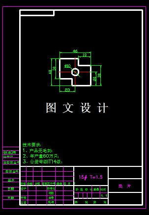 垫片落料冲孔倒装复合模设计,包括装配图和工件图。 由工件图看,此工件只有落料和冲孔两个工序,材料为10#钢,优质碳素钢,具有良好的冲压性能,适合冲裁,工件结构相对简单,孔边距远大于凸、凹模允许的最小壁厚,故可以考虑采用复合冲压工序。工件的尺寸全部为自由公差,可看作IT14级,尺寸精度较低,普通冲裁完全能满足要求,只是产品四周都是直角,为防止在加工凹模时由于热处理应力集中,导致凹模开裂,建议产品直角处增加过渡R角,防患于未然。