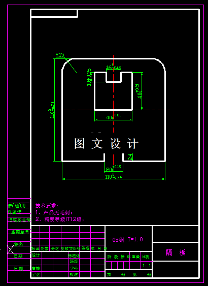隔板落料冲孔倒装复合模设计,包括装配图,5张非标零件图。 本次设计产品所用的材料为08钢,优质碳素结构钢,其力学性能如下:τ=260-360Mpa,σb=330-450Mpa,(《冷冲压工艺与模具设计》P322),零件图上未注公差等级,属自由尺寸,按IT14级确定工件尺寸的公差.该制件形状简单,外形尺寸较小,孔到边的距离为110/2-40=15mm,远超过两倍的材料厚度,根据资料可查,大于等于材料厚度的1.5倍即可以采用复合模,本次设计从产品尺寸来看,设计复合模或者级进模,均可以。从形状看,厚度一般,属于普通冲压件,所以采用复合模设计。