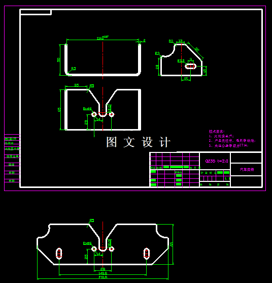 汽车座椅弯曲模设计,包括装配图,3张非标零件图。 由工件图可知,该工件的加工涉及到落料、冲孔、弯曲三种工序内容。根据工序结合,选择合理方案。 方案一:分别由三套单工序模具来进行生产; 方案二:由一套级进模来完成两个工序; 方案三:由一套复合模完成落料冲孔,U形弯曲部分直接由弯曲模完成; 由于是中批量生产,且单工序模具成本低,生产难度小,且能保证冲裁件的弯曲尺寸和平整性,生产效率高,故选择方案三。
