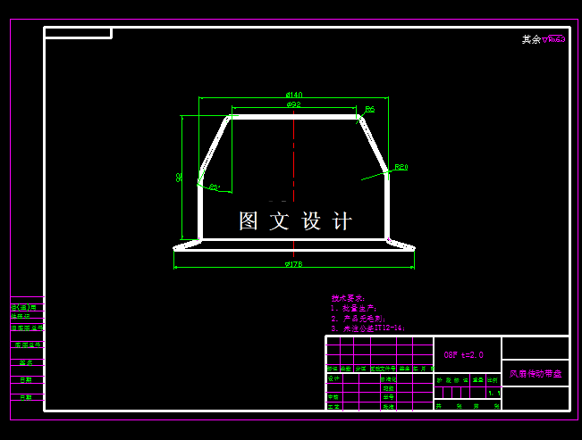 风扇传动带盘二次拉伸模具设计,包括装配图,3张非标零件图。 本次设计的课题形状,深拉伸件,一眼看上去是带凸缘的拉伸件,但是此工件的凸缘不规则,呈一定的角度,所以可采用圆筒形拉伸件,最后口部扩口实现,所以开始拉伸时可以按圆筒形件工艺计算,所以要计算最初的展开尺寸,毛坯直径,然后在第二次拉伸时锥度凸缘,并整形达到要求。
