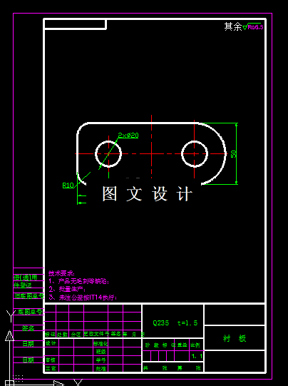 衬板落料冲孔倒装复合模设计,包括装配图,3张非标零件图。 本设计是Q235,属于普通碳素钢。其力学性能是强度、硬度和塑性指标适中。经退火后,冲裁的加工方法是完全可以成形的。另外,产品对于厚度和表面质量没有严格要求,所以尽量采用国家标准的板材,其冲裁出的产品的表面质量和厚度公差就可以保证。