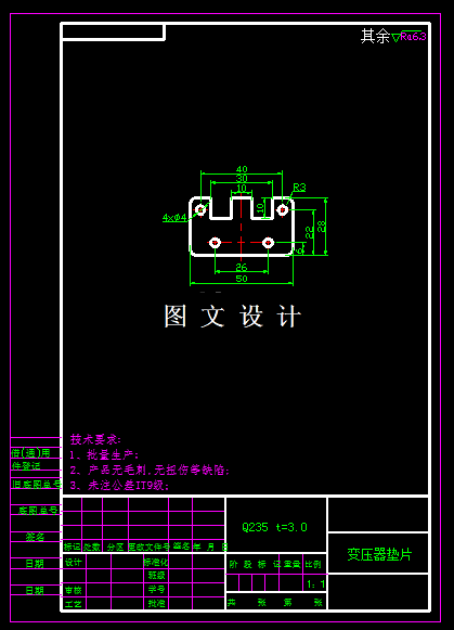倒装落料冲孔复合模设计,包括装配图,3张非标零件图。 本文阐述了冲压复合模的结构设计及工作过程,通过工艺分析,采用落料冲孔工序,通过冲裁力、顶件力、卸料力等计算,确定模具类型。该模具采用后侧导柱模架,左右两边的导柱和导套采用同一型号。落料凹模采用整体结构,废料从凸凹模的开槽中卸出。本模具性能可靠,运行平稳,提高了产品质量和生产效率,降低劳动强度和生产成本。