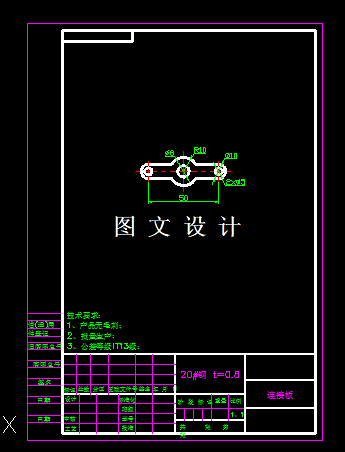 连接板倒装落料冲孔复合模,4张非标准零件图。 该产品材料20#钢,属于优质碳素结构钢,具有较好的可冲压性能.,零件结构简单,四周均为R角,适合冲压,零件图上所有未注公差的尺寸,属自由尺寸,可按工T12级确定工件尺寸的公差。