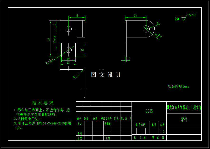 本设计是对圆孔折弯件进行冲压模工艺分析和模具设计,根据对零件的综合分析,采用自动送料技术(即级进模),级进模模具可以大大的提高劳动生产效率,减轻工人负担,具有重要的技术进步意义和经济价值。在设计过程中,首先使用UG和Auto CAD软件对圆孔折弯件进行二维和三维造型,明确设计思路。然后,对圆孔折弯件的形状、尺寸标注、精度及生产批量进行分析,在综合考虑其经济性、零件的冲压工艺性以及复杂程度和精确度等诸多因素的基础上确定圆孔折弯件的冲压成型工艺方案和结构形式。并对各个具体参数进行了详细的计算和校核,并选择合适的压力机。最后,运用UG和Auto CAD软件绘制了模具的装配图和零件图,以及编制重要零件的加工工艺过程。设计中了解落料模、弯曲模、切边模和冲孔模的特点和需要注意的问题。