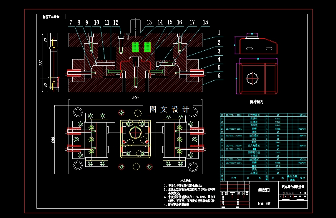 此设计为拔杆盖冲压模具设计(17142),采用材料:08F;板厚:1.5mm,提供二维装配图1张及主要零件图10张+设计报告文档( 文档约1.2W字 30页)。本文介绍了对给定的拔杆盖零件进行冲压模具设计。在查阅相关资料和对产品形状仔细分析的基础上进行冲压工艺的选择;冲压模具的选择是在综合考虑了经济性、零件的冲压工艺性以及复杂程度等诸多因素的基础上进行的;产品毛坯展开尺寸的计算是在方便建设又不影响模具成型的前提下简化为所熟悉的模型进行的。冲压加工利用安装在冲压设备上的冲模使板料分离或产生塑性变形,能冲压出其他加工工艺难以加工或无法加工的复杂制件。通过冲裁力、顶件力、卸料力等计算,确定模具类型。该模具采用后侧导柱模架,左右两边的导柱和导套采用同一型号。落料凹模采用整体结构,废料从凸凹模的开槽中卸出。本模具性能可靠,运行平稳,提高了产品质量和生产效率,降低劳动强度和生产成本。冲压具有质量稳定、尺寸精度高、生产效率高、材料利用率高、易于实现机械化与自动化生产等特点。冲压加工已成为现代工业生产的重要手段和发展方向,是提高生产率、提高产品质量、降低生产成本、进行产品更新换代的重要保证。本文还对冲压成型零件和其它相关零件的选择原则及选择方法进行了说明,介绍了几种产品形状的毛坯展开尺寸的计算方法和简化模型,以及本冲压模具设计所参考使用的参考文献。
