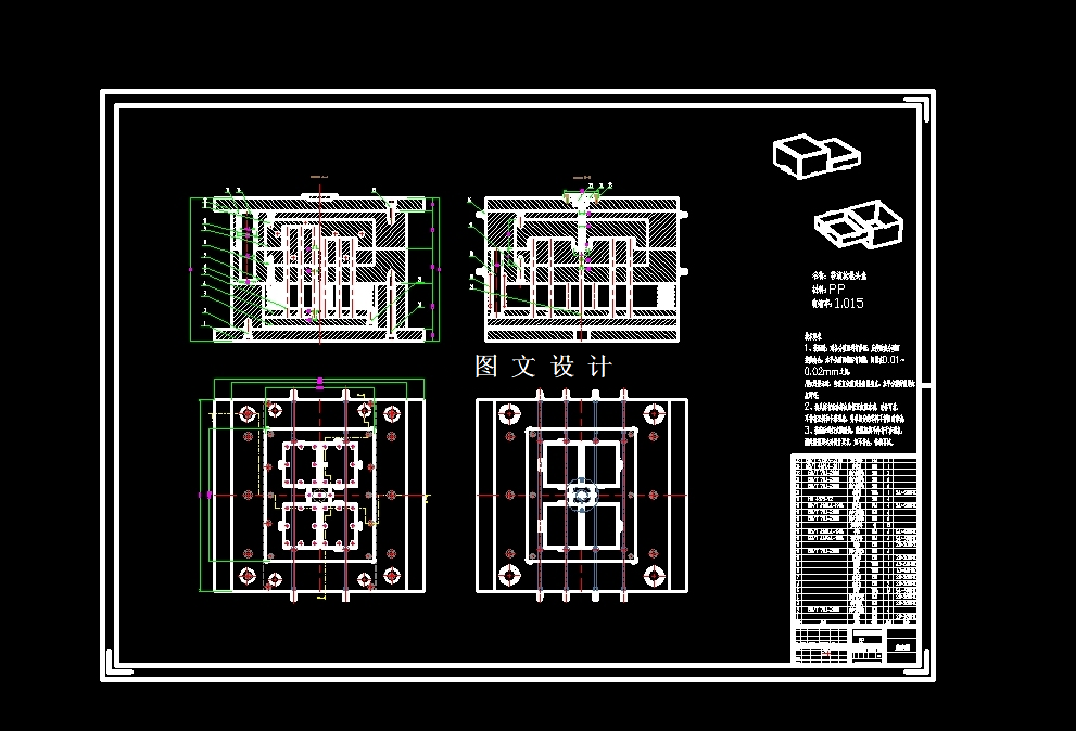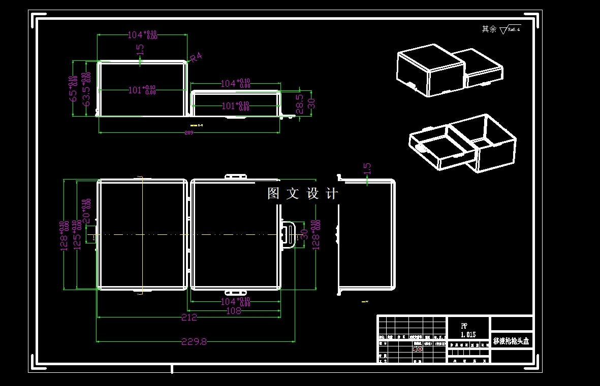 此设计为移液枪枪头盒注塑模具设计(17141),采用一模二腔,侧浇注口进行填充,提供三维(UG格式)+二维装配图1张及主要零件图9张+设计报告文档( 文档约1.9W字 54页)。本论文所讲的设计是移液枪枪头盒塑零件注塑模具设计,本论文中非常详细的叙述了注塑模具在成型时的成型加工工艺。以及模具制造的制造技术及研究绘制模具图的全部流程。然后再对本零件的实行使用性以及结构上面的进行比较详细的分析及工艺过程来演示分析,并学习和使用CAD,NXug,pore等软件进行绘图和分析、同时对成型过程中各种参数的变化,在模具设计时给以优化及避免。本文列出了注射机的各项参数及选择的重要根据,并进行了对主要的参数做了一系列进行了计算与重要部位的校核。体会到了零件的分析,模具的设计布局,同时也为本模具说明书做了铺垫。设计完成注塑分析与设计,需要画出整套装配图及零件图。本模具机能比较可靠,可以提高产物的质量和出产效率,使成本降到最低。