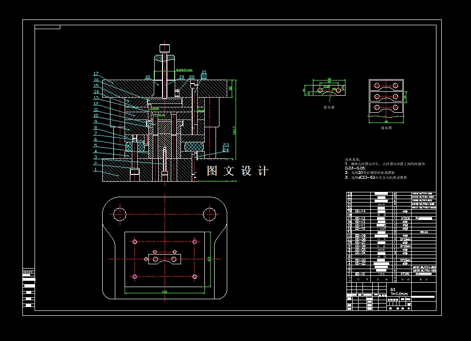 此设计为止动片冲压复合模具设计,采用材料:低碳钢板B3;板厚:0.5mm,提供二维装配图1张及主要零件图10张+设计报告文档( 文档约1.3W字 32页)。在查阅相关资料和对产品形状仔细分析的基础上进行冲压工艺的选择;冲压模具的选择是在综合考虑了经济性、零件的冲压工艺性以及复杂程度等诸多因素的基础上进行的;产品毛坯展开尺寸的计算是在方便建设又不影响模具成型的前提下简化为所熟悉的模型进行的。冲压加工利用安装在冲压设备上的冲模使板料分离或产生塑性变形,能冲压出其他加工工艺难以加工或无法加工的复杂制件。通过冲裁力、顶件力、卸料力等计算,确定模具类型。该模具采用后侧导柱模架,左右两边的导柱和导套采用同一型号。落料凹模采用整体结构,废料从凸凹模的开槽中卸出。本模具性能可靠,运行平稳,提高了产品质量和生产效率,降低劳动强度和生产成本。冲压具有质量稳定、尺寸精度高、生产效率高、材料利用率高、易于实现机械化与自动化生产等特点。