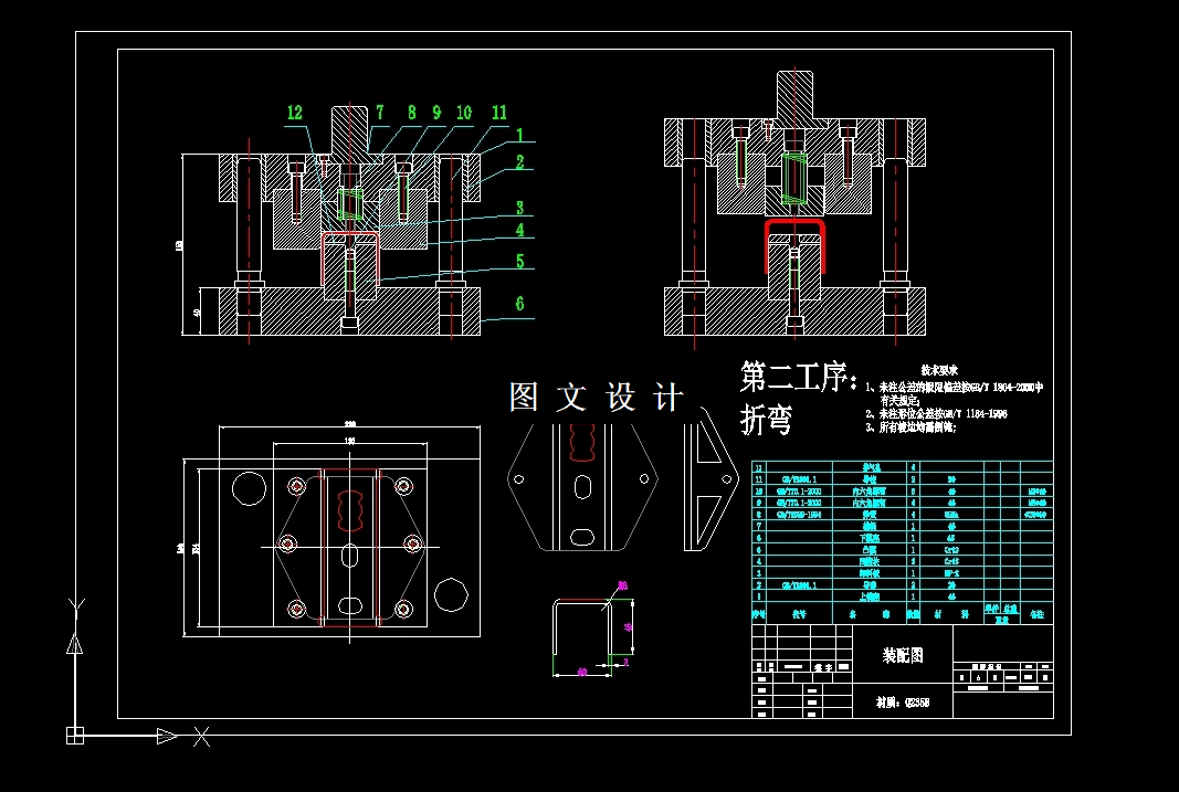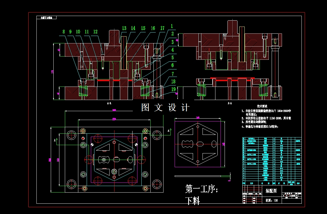 此设计为连接块冲压模具设计(17106),采用材料:低碳钢板10#;板厚:3.0mm,提供二维装配图2张及主要零件图21张+工艺卡+设计报告文档( 文档约1.2W字 28页),无三维。该模具采用后侧导柱模架,左右两边的导柱和导套采用同一型号。落料凹模采用整体结构,废料从凸凹模的开槽中卸出。本模具性能可靠,运行平稳,提高了产品质量和生产效率,降低劳动强度和生产成本。冲压具有质量稳定、尺寸精度高、生产效率高、材料利用率高、易于实现机械化与自动化生产等特点。