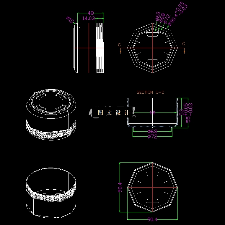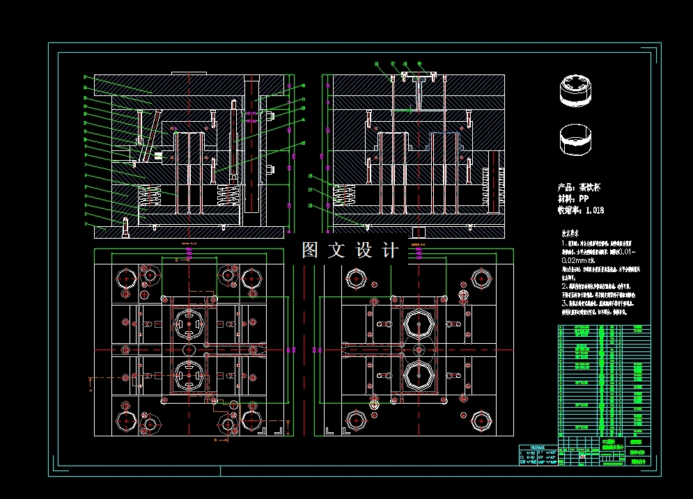 此设计为茶饮杯螺旋底盖注塑模具设计及型腔加工仿真(17070),采用一模二腔,点浇注口进行填充,提供三维(UG格式)+二维装配图1张及主要零件图12张+编程仿真+设计报告文档( 文档约1.7W字 43页)。通过对塑件材料的成型工艺的正确分析,所以选择了较理想的注塑机及对有关注塑机参数进行了校核。然后是塑模中的分型面的选择。通过分析比较,选择了一种最佳方案。侧抽芯主要参数的确定,参照了斜导柱的计算方法,指出了侧抽芯机构的设计要点。对浇注系统的设计,确定了主流道,分流道,浇口及冷料穴等。然后是成型零件的设计及尺寸计算,我确定了型腔深度,型腔高度,型腔壁厚,型芯高度。然后是冷却系统的设计及计算,确定了是否需要冷却系统等,最后是对推出机构的设计,合模导向机构的设计以及对其它机构的设计等。