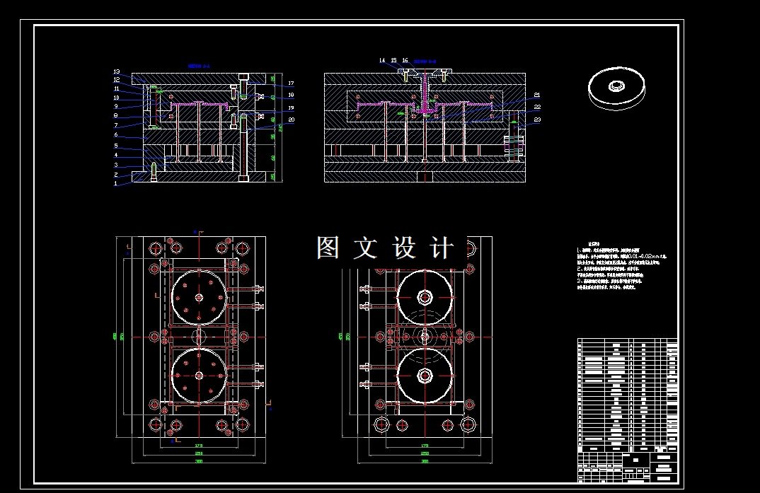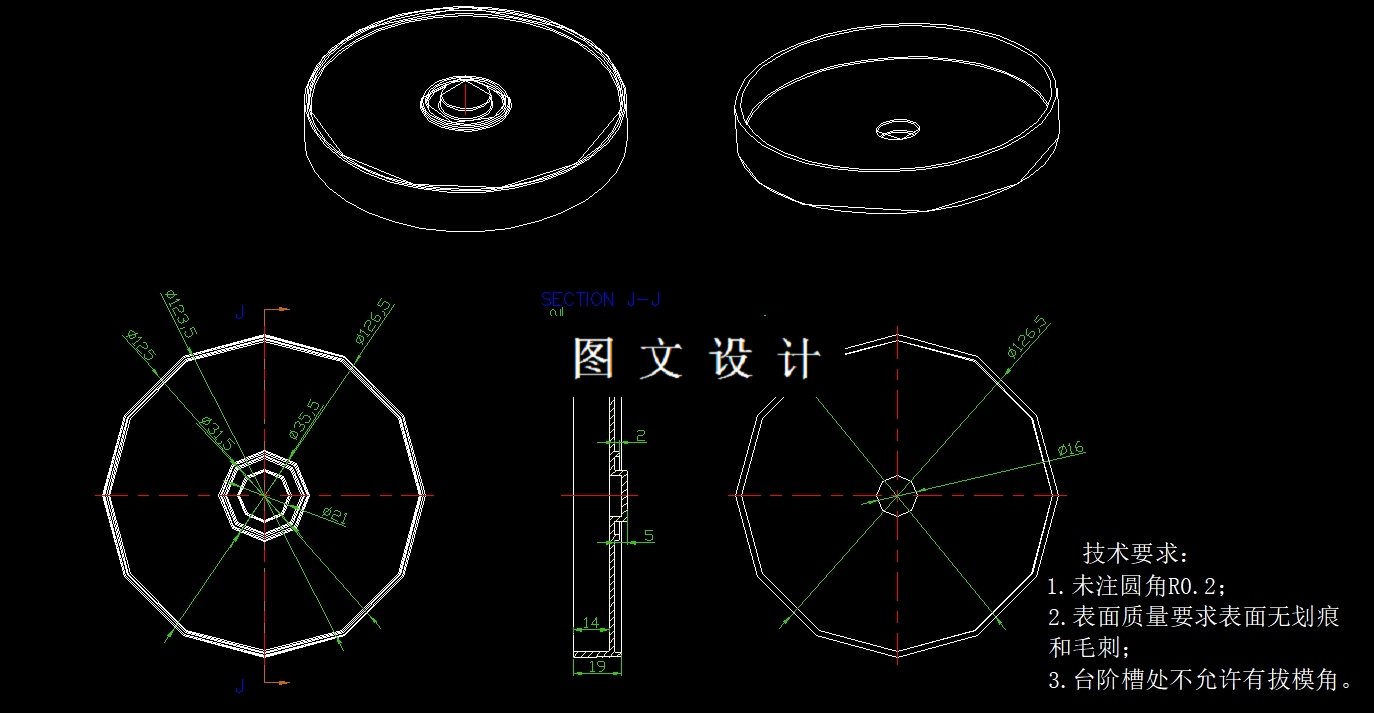 此设计为圆盖座注塑模具设计(18139),采用一模二腔,侧浇注口进行填充,提供三维(UG格式)+二维装配图1张及主要零件图7张+设计报告文档( 文档约0.7W字 22页)。分析塑胶制件产品的全方位的工艺性、控制尺寸制造精密等级及塑胶制件产品的外观控制要点和技术规范。得出整体设计前要对塑胶制件产品的技术控制要求,方可进行核芯成型部位、射胶进入、温控调节、排困气、顶出等系统性设计,还要对注射设备进行采选及设备参数校对,且还须考虑注射模具机构安装和进行试配,使注射模具能顺顺利利进行装配。所设计塑胶制件产品的注射模具,在深入贴合技术塑件控制要求的分析结合下,在众多方案之中最终选中一模两件,射胶进入则为产品外边缘轮廓进浇。塑料成型机器设备采选常用国产侧卧躺式的XS-ZY-500型号。