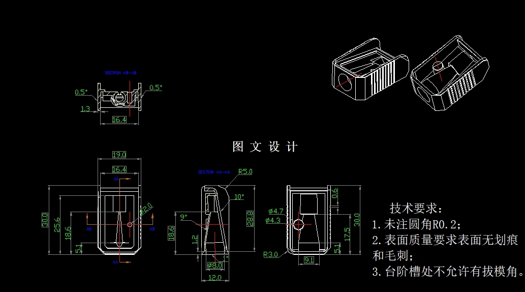 此设计为转笔刀外壳注塑模设计(18105),采用一模二腔,侧浇注口进行填充,提供三维(UG格式)+二维装配图1张及主要零件图19张+模流分析+爆炸图+设计报告文档( 文档约1.8W字 50页)。通过三维软件UG,对转笔刀外壳零件进行模型的绘制,同时对模具的成型零件进行设计,并绘制出相关的零件图纸文档,完整了这图纸部分的设计。该转笔刀工具外壳外轮廓呈矩形形状,内部中间位置有一个尾部是锥度形,尾部是圆柱口,此位置是用于铅笔卷销时候伸进的部位。