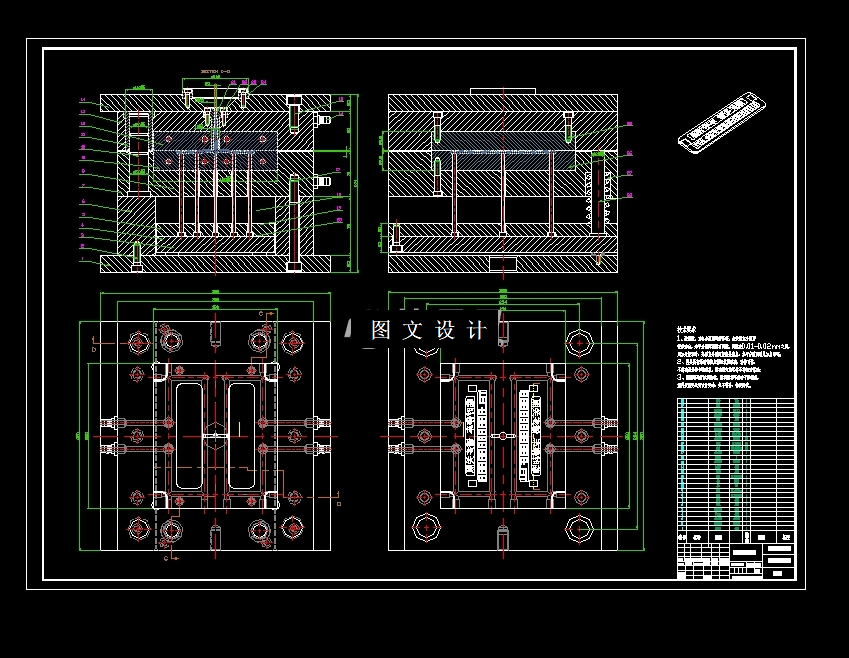 此设计为临时停车牌注塑模具设计(18089),采用一模二腔,侧浇注口进行填充,提供三维(UG格式)+二维装配图1张及主要零件图9张+设计报告文档( 文档约1.2W字 35页)。对零件的分型面的确定及选择,将采用一模二腔,侧浇注口进行填充。最后对设计模具中调节模具温度的水路选择了环形冷却水路,它的直径为8mm。塑料件为长方形形件,均匀壁厚的塑件能够减少它的内应力。零件上顶面有一不平的的凸状物,这样能安全地顶出模,并能保证表面质量。