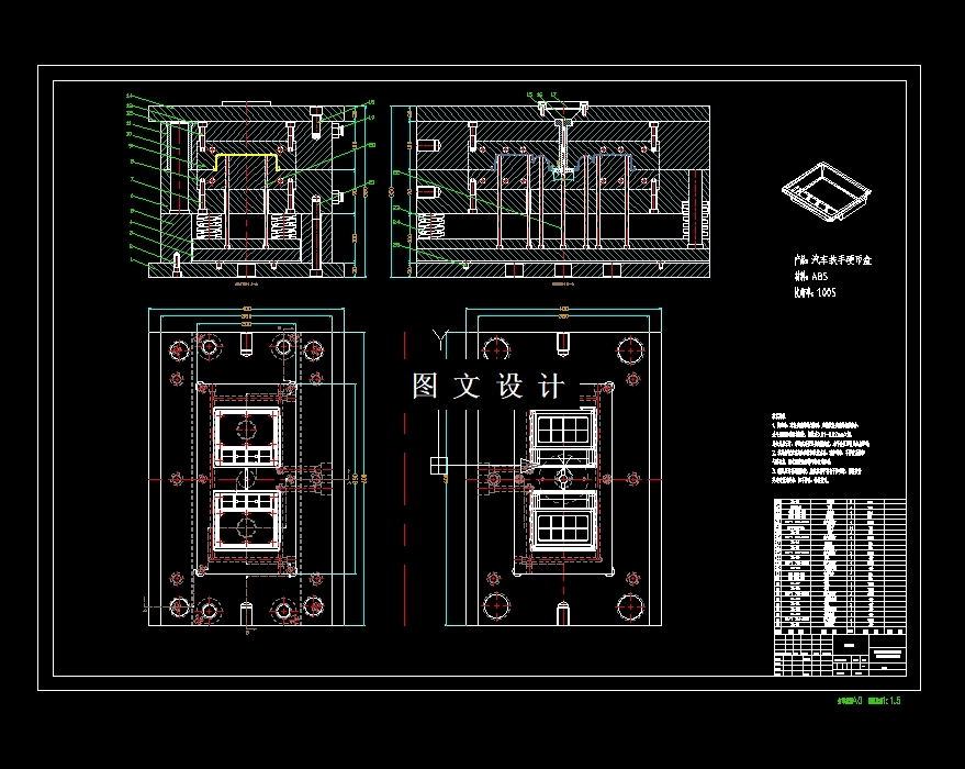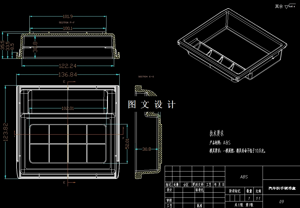 此设计为汽车扶手硬币盒注塑模具设计(18074),采用一模二腔,侧浇注口进行填充,提供三维(UG格式)+二维装配图1张及主要零件图10张+设计报告文档( 文档约1.2W字 36页)。针对一个塑料制成的汽车扶手硬币盒,通过三维软件UG,对汽车扶手硬币盒进行模型的绘制,同时对模具的成型零件进行设计,并绘制出相关的零件图纸文档。设计过程中,模具选择两个型腔的结构,采用侧浇口以及环绕式冷却的方法,对产品进行注塑。本课题设计的模具具有良好的工作稳定性,结构比较紧凑,注塑过程比较平稳,而且冷却的效率也比较高,可以减轻工人的劳动强度,提高生产效率,降低生产成本,最重要可以保证产品的精度。除模具结构设计外针对塑料件并对零件的工艺进行了分析。