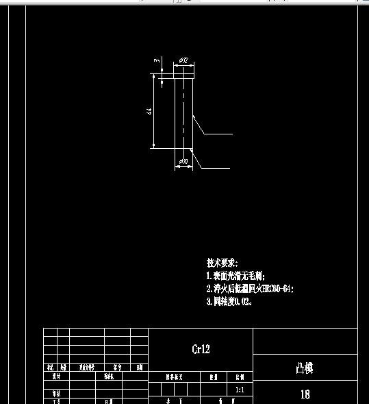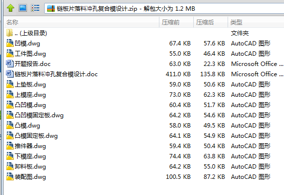 此倒装式复合模具的设计,包含:1、首先对零件的工艺性进行分析,然后选择了几个可行方案,接着对工艺方案进行演算和比较,最终确定采用倒装式复合冲裁模,2、制定工艺流程,选择排样图,对材料的利用率进行计算,3、初步确定冲模结构,包括:(1)模具的具体形式(2)定位装置(3)卸料装置(4)导向零件(5)模架4冲裁力计算5、模具刃口尺寸的计算6、冲裁模具主要零件的设计及计算,包括:(1)落料凹模(2)冲孔凸模(3)凸凹模7、标准零件的设计及计算,包括(1)模架(2)导柱、导套(3)上、下模座(4)卸料螺钉8、其它支撑零件,包括(1)模柄(2)固定板及垫板9、紧固件的选择。
