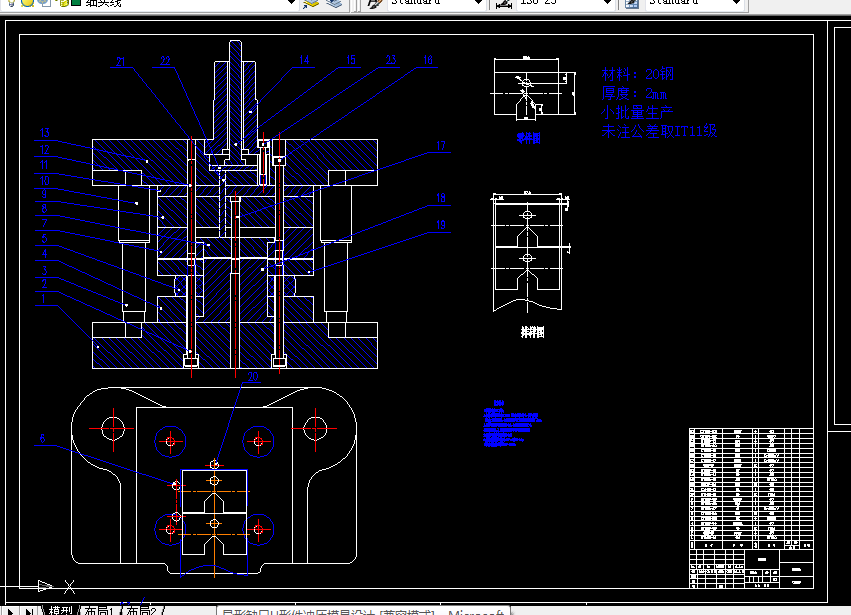 一般的冷冲压模具设计是根据设计组件的大小、材料,大规模生产等过程一步步分析来确定程序的冲裁工艺设计和模具结构,然后通过工艺设计计算,计算冲压力和压力中心,初选压力机以及标准模架。本次设计介绍了模具设计中的排样与送料方式和卸料与导向方式,计算出凸、凹模刃口尺寸和公差,最后设计选用零部件,检查并绘制模具装配图。而一些组件是按标准选择,并没有深入的设计。此次设计经过处理过程的分析,在综合考虑了经济性、零件的冲压工艺性以及复杂程度和精确度等诸多因素的基础上最终完成。