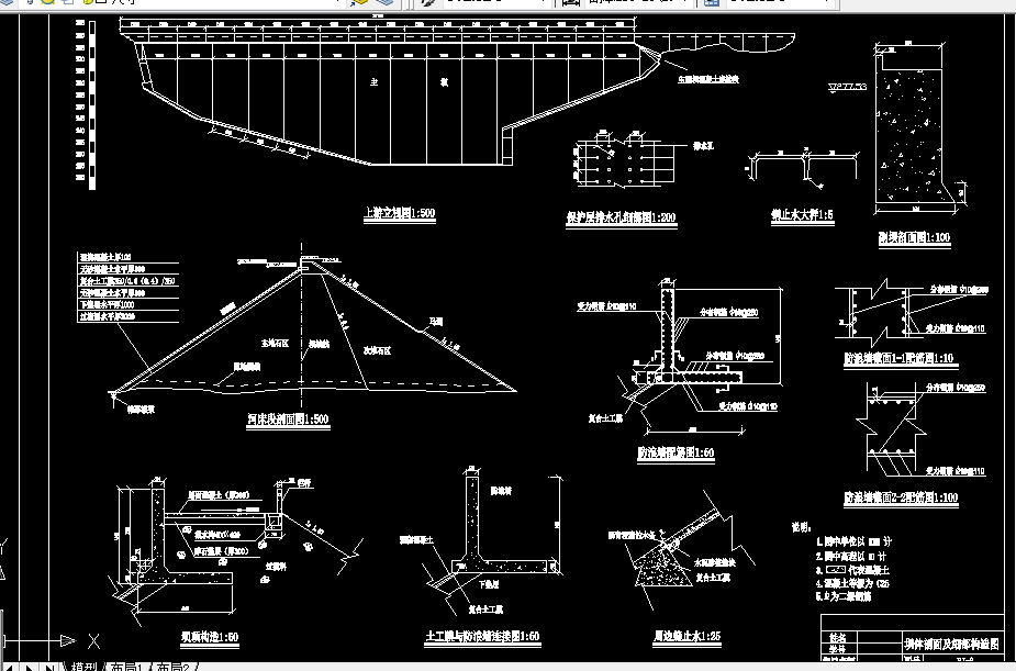 ⒊ 详细做出大坝设计,通过比较,确定大坝的基本剖面和轮廓尺寸,拟定地基处理方案与坝身构造,进行水力、静力计算;进行专题一(材料选型及护坡设计与计算)的设计;