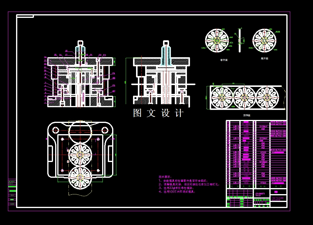 此设计为卫浴下水过滤板冲裁工艺与模具设计,所用的材料为不锈钢板 1Cr18Ni9Ti ,板厚:1.0mm,提供三维(UG格式)+二维装配图1张及主要零件图17张+设计报告文档( 文档约1.1W字 30页)。本文对冲压成型零件和其它相关零件的选择原则及选择方法进行了说明,介绍了几种产品形状的毛坯展开尺寸的计算方法和简化模型,以及本冲压模具设计所参考使用的参考文献。