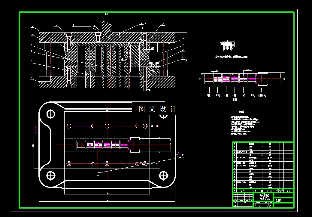 此设计为引线框架成形模具CAD级进设计,用引线框架(铜合金)制作,原料的厚定为0.18mm,提供二维装配图1张及主要零件图13张+设计报告文档( 文档约1.2W字 36页)。此次设计以引线框架成形模具为设计对象,根据所学的知识对引线框架进行冲压工艺性分析及模具设计,通过对引线框架的结构、所使用的材料进行工艺性分析,选取合理的加工方式。运用各加工工艺的方法进行对比,来选取合理的工艺方案,最后确定为级进冲压模具,然后进行必要的工艺计算,完成整个冲压模具设计过程。