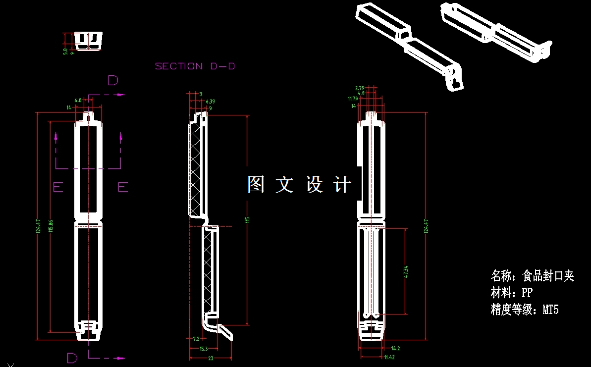 此设计为食品封口夹注塑模具设计,采用一模二腔,侧浇注口进行填充,提供三维(UG格式)+二维装配图1张及主要零件图9张+模流分析+设计报告文档( 文档约1.6W字 49页)。本次设计采用PA66塑料作为原料进行注塑成型,通过所做塑件的工艺性分析和材料的本身属性,选用卧式注塑机及采用一模两腔的成型方式。同时,对模具内部零件各个部位进行必要的计算和强度校核,此外还对浇注系统、成型系统、冷却系统、推出机构、分型面的选择、成本预算和环境分析进行了分析设计。为了满足对塑件表面光滑度的要求,提高加工效率和精度,采用侧浇口进胶的两版模。然后再进行三维建模和完成二维的装配图和主要零件图,最后编写说明书。
