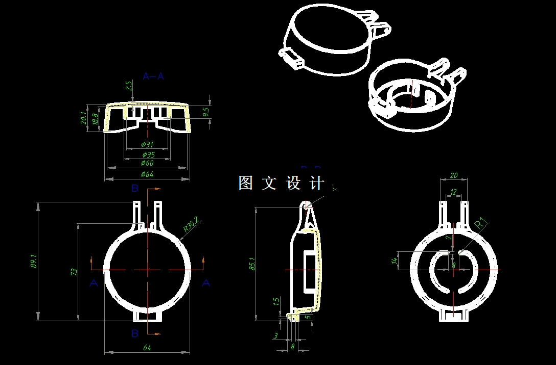 此设计为保温杯杯盖上体成型工艺与模具设计,采用一模二腔,侧浇注口进行填充,提供三维(UG格式)+二维装配图1张及主要零件图12张+模流分析+设计报告文档( 文档约1.7W字 53页)。为了更好的完成本次设计,需要做非常多的工作。第一步是要清楚地认识 和了解该塑件的基本信息,比如它的用途、基本形状构造和所用塑胶的材料。第二步是要考虑该塑件的分型面,这是非常重要的一步,分型面影响到塑件的整套模具设计的脱模机构设计以及塑件的外观。第三步是确定型腔的数量和布局。 第四步根据塑件的结构,判断塑件需不需要进行侧抽芯。第五步是完成塑件的浇注系统,其中包括进胶口、流道、进胶系统相关配件等等。第六步是确定塑件的顶出系统,常见的顶出系统有推杆和推板。第七步是确定塑件的冷却系统,原则是要冷却均匀。第八步是要结合前面的数据选择合适的模架。