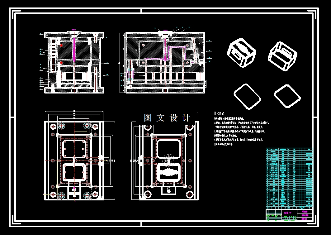 此设计为纸巾盒塑料模具设计,采用一模二腔,侧浇注口进行填充,提供三维(UG格式)+二维装配图1张及主要零件图15张+设计报告文档( 文档约1.7W字 44页)。过程中可以运用UG和CAD等电脑软件对塑件的塑胶模具设计进行成型分析和建模设计。三维图方面不仅仅要完成塑件的建模,还需要完成塑件的整套注塑模具的建模。除此之外,二维图纸方面需要完成此套注塑模具的装配图、产品图以及重要的零件图。根据塑件的构造,分析适合它的模具结构方案,最后选择了盒和盖一起注塑成型的一模两腔的方案。这次的注塑模具有很多优点,比如模具的结构不复杂、加工简单、模具稳定不容易坏、精度达标、生产过程中报废率低、维修方便、使用时间相对长等等。本次的内容不仅仅介绍和分析了模具的分型面和浇注系统,同时也对模具的抽芯机构、运水、调温系统等等要点作出了相当详尽的介绍和分析。