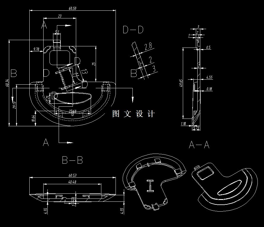 此设计为无线鼠标电池盖设计,采用一模二腔,侧浇注口进行填充,提供三维(UG格式)+二维装配图1张及主要零件图19张+模流分析+设计报告文档( 文档约1.6W字 50页)。完成LG无线蓝牙鼠标电池盖的塑胶模具设计是,根据塑件的构造,分析适合它的模具结构方案,选择了一模两腔的方案,模具结构方面有斜顶抽芯机构及推杆推出,侧浇注口浇注,直径8mm的环绕式冷却管道,选用了C型标准二板式模架。注塑机选用为XS-ZY-250型。1766582