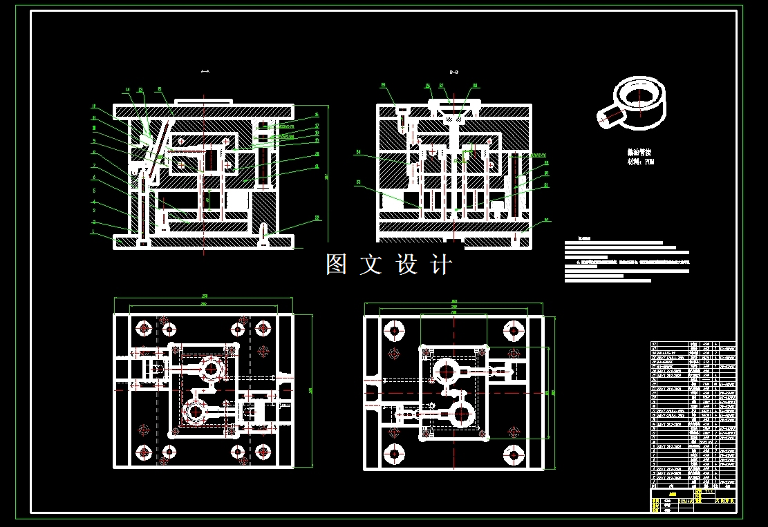 此设计为输油管接头注塑模具设计,采用一模二腔,侧浇注口进行填充,提供三维(UG格式)+二维装配图1张及主要零件图10张+设计报告文档( 文档约1.3W字 42页)。第一步要做的是观察塑件,研究该塑件的重要尺寸,然后用三维和二维软件把它的基本外形以及重要尺寸画出来。通过已经画好的三维图和二维图我们可以知道,该塑件整体呈圆形,内部为中空结构的壳体零件,需塑件壁厚都很均匀约3-9mm,是一个厚壁的受力零件,是适用注塑生产成型工艺的。该塑件的基本外形直径48mm宽总高22MM,68MM,长使用UG.NX 或者三维CAD设计软件将带输油管接头的三维模型建出来。
