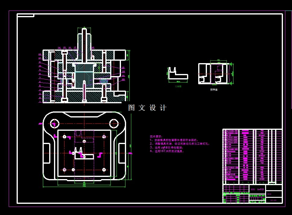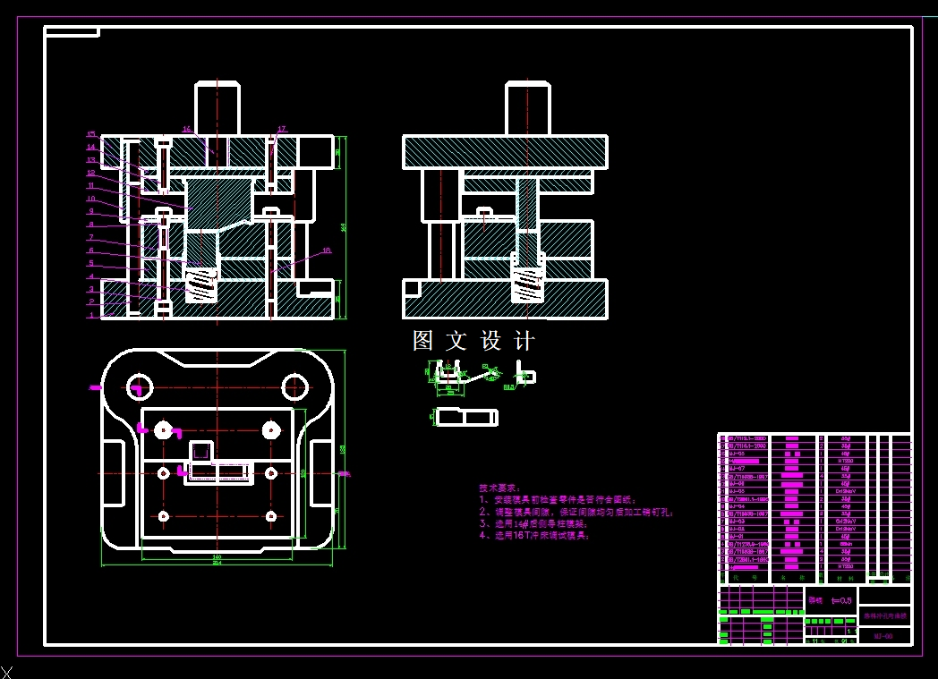 此设计为磷铜导电弹片模具设计,采用的加工材料为磷铜,厚度:0.5mm,提供二维装配图2张及主要零件图21张+设计报告文档( 文档约1.2W字 36页)。该冲压模具设计中,选取的设计题目是磷铜导电弹片冲压成型加工工艺分析与模具设计,本次设计的主要内容有对磷铜导电弹片制品的技术参数和产品结构详情进行分析和考量,确定制品的加工方式为复合模组合模具的加工形式,在此基础上对制品性能进行分析,确定加工材料以及加工器械。确定好加工方式后,对模具的排样方式、冲裁力、冲裁零部件等方式进行分析和计算。确定以上相关内容后,决定采用两幅模具对工件进行设计,分别为一幅落料模与一幅弯曲成型模具,采用软件对冲压模具的图纸进行绘制。最后确定该冲压模具的装配流程以及相关的注意事项,确保模具装配过程符合要求。通过上述流程后,完成了本次模具的设计和分析。