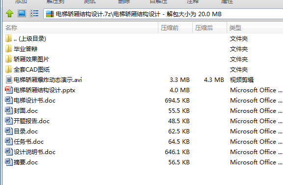 本次设计的内容主要由轿厢的外形结构设计和技术文件两部分构成。其中结构部分使用AUTOCAD和SOLIDWORKS软件实现全部平面图纸和三维模型的绘制。包括轿厢架、轿厢壁、轿厢底、轿厢顶以及其他结构部件。技术文件主要包括了轿厢外设部件和内部结构的一系列受力和技术参数的分析计算。包括电梯的工况、钢丝绳及绳头锥套的的强度计算、轿厢架的强度计算、电梯导轨的计算以及其他设备的选型计算。