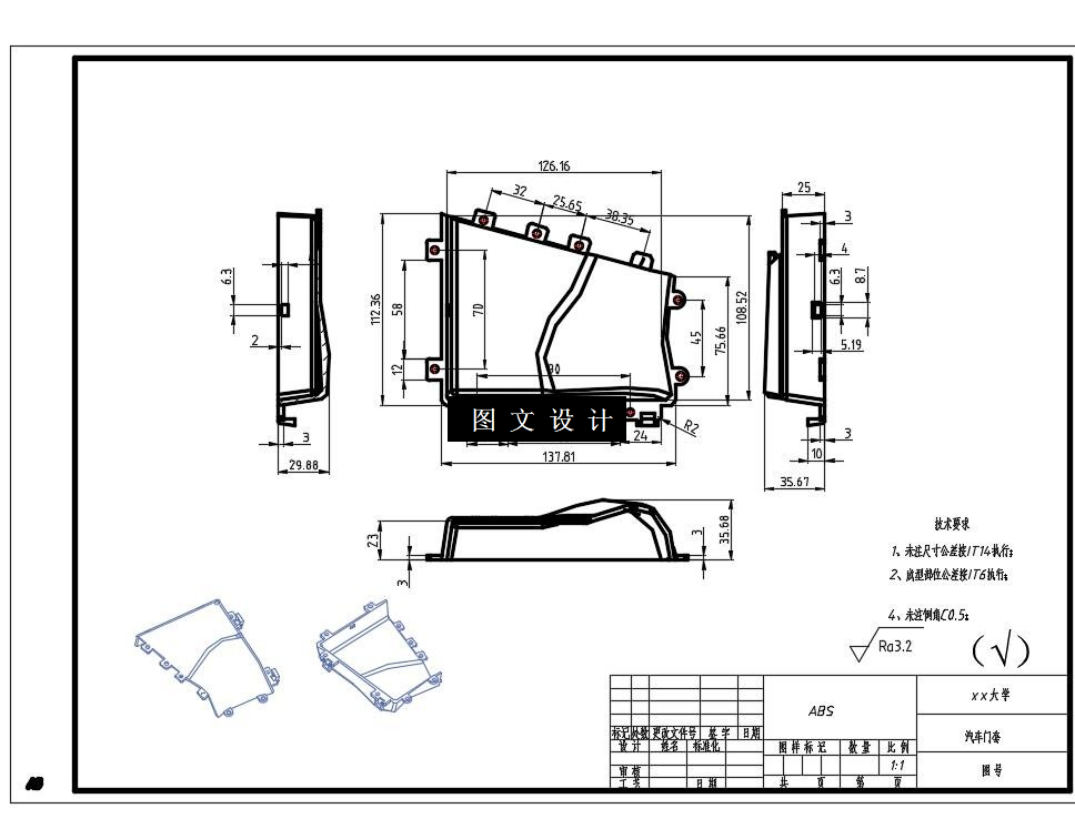 本文研究的是汽车门套的注塑成型及模流分析。首先分析产品的成型工艺,然后根据产品结构,设计如何分型,及型腔数目,进胶方式。过程中要充分考虑到零件的加工方法,尽量简便精准,并进行相关尺寸的计算和校核,再设计浇注系统,冷却系统,排气系统,脱模机构,导向机构,以及模架的选择。通过CAD,ug ,等软件辅助分析设计是否合理,选择合理的工艺参数和设计方案。
