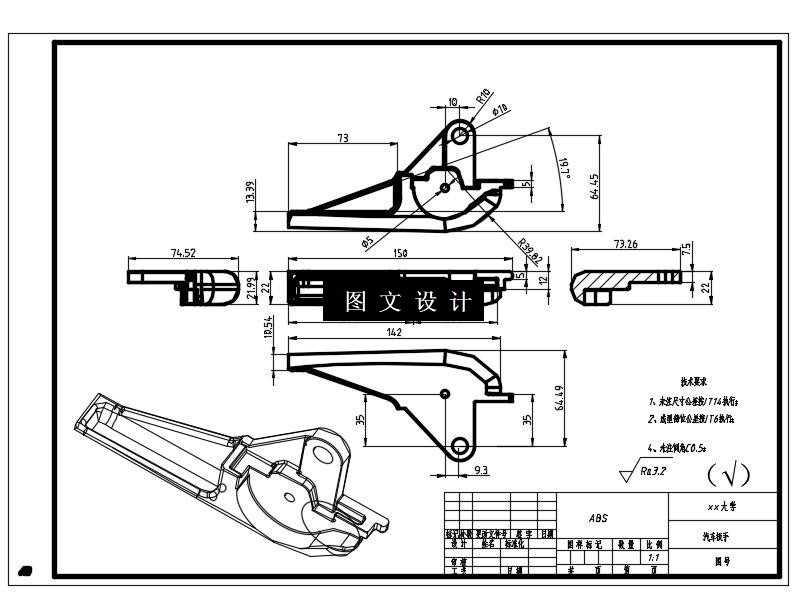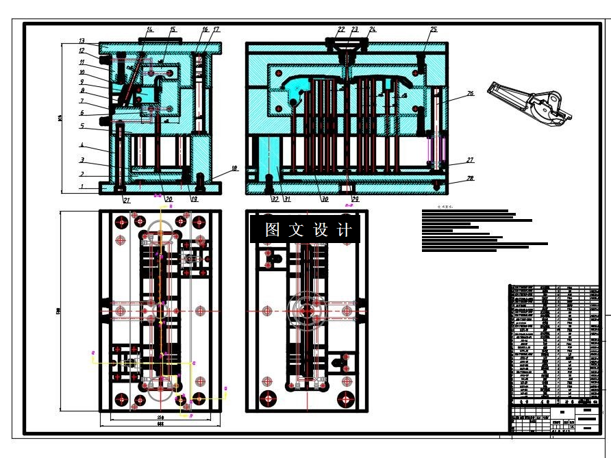 本文研究的是汽车扳手的注塑成型。首先分析产品的成型工艺,然后根据产品结构,设计如何分型,及型腔数目,进胶方式。过程中要充分考虑到零件的加工方法,尽量简便精准,并进行相关尺寸的计算和校核,再设计浇注系统,冷却系统,排气系统,脱模机构,导向机构,以及模架的选择。通过CAD,UG ,等软件辅助分析设计是否合理,选择合理的工艺参数和设计方案。