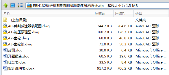 本次的设计内容为EBH132掘进机截割部传动系统的设计计算,通过查阅相关资料,确定传动方案,设计传动零件。设计中,对截割部进行了详细的设计,计算和说明,该掘进机采用横轴式的设计,这样可以提高破落煤岩的效率,促进生产率。 为了达到增加掘进机截割长度的要求,所以采用了三级圆锥圆柱齿轮减速器,并且增加惰轮使悬臂有足够的长度,满足了截割范围及以下切深度的要求,并且使截割头获得了所需要的转向。其中,三级圆锥圆柱齿轮减速器包括以下特点: