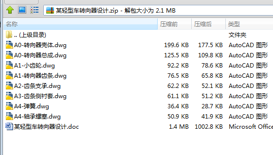 本次设计设计一款用于轻型汽车的转向器。论文首先对转向系的作用,基本构成、要求和转向系统的总体性能进行了分析,同时对转向系的空间位置及结构特点进行分析,确定了转向梯形的型式,简单的概述了转向传动机构。确定了转向器的结构和布置形式,分析了转向器的啮合传动的特点和传动效率。根据汽车工程参考某款轻型汽车的转向器的参数,对转向器进行设计,并对齿轮齿条的齿面接触强度和齿根弯曲强度进行校核,同时利用AUTOCAD软件绘制装配图和零件图。