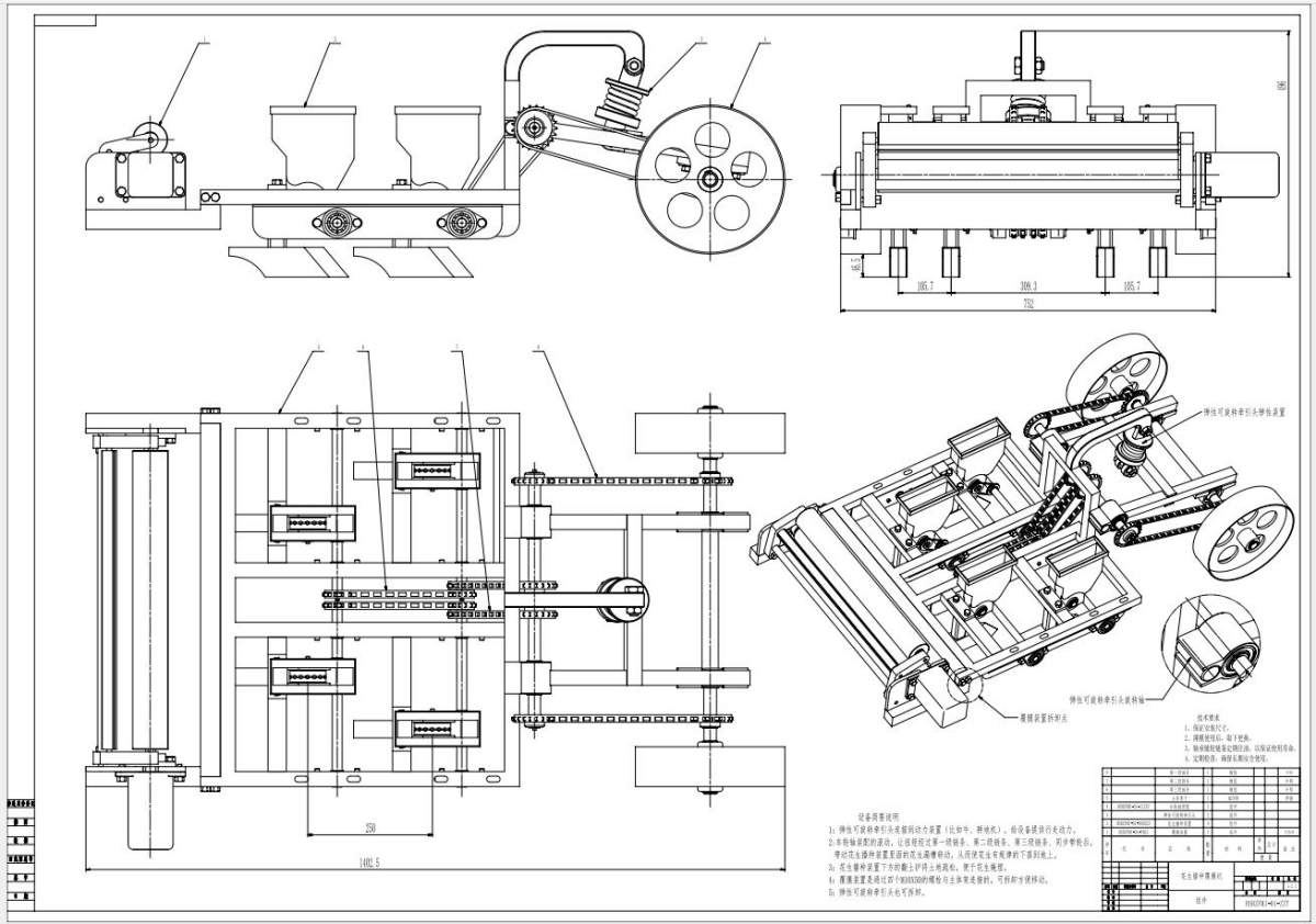 本作品是一款农业设备花生播种覆膜机,设备的工作原理大致为:车轮轴装配的滚动,让扭矩经过第一级链条、第二级链条、第三级链条、同步带轮后,带动花生播种装置里面的花生漏槽转动,从而使花生有规律的下落到地上。花生播种装置下方的翻土铲将土地疏松,便于花生掩埋。