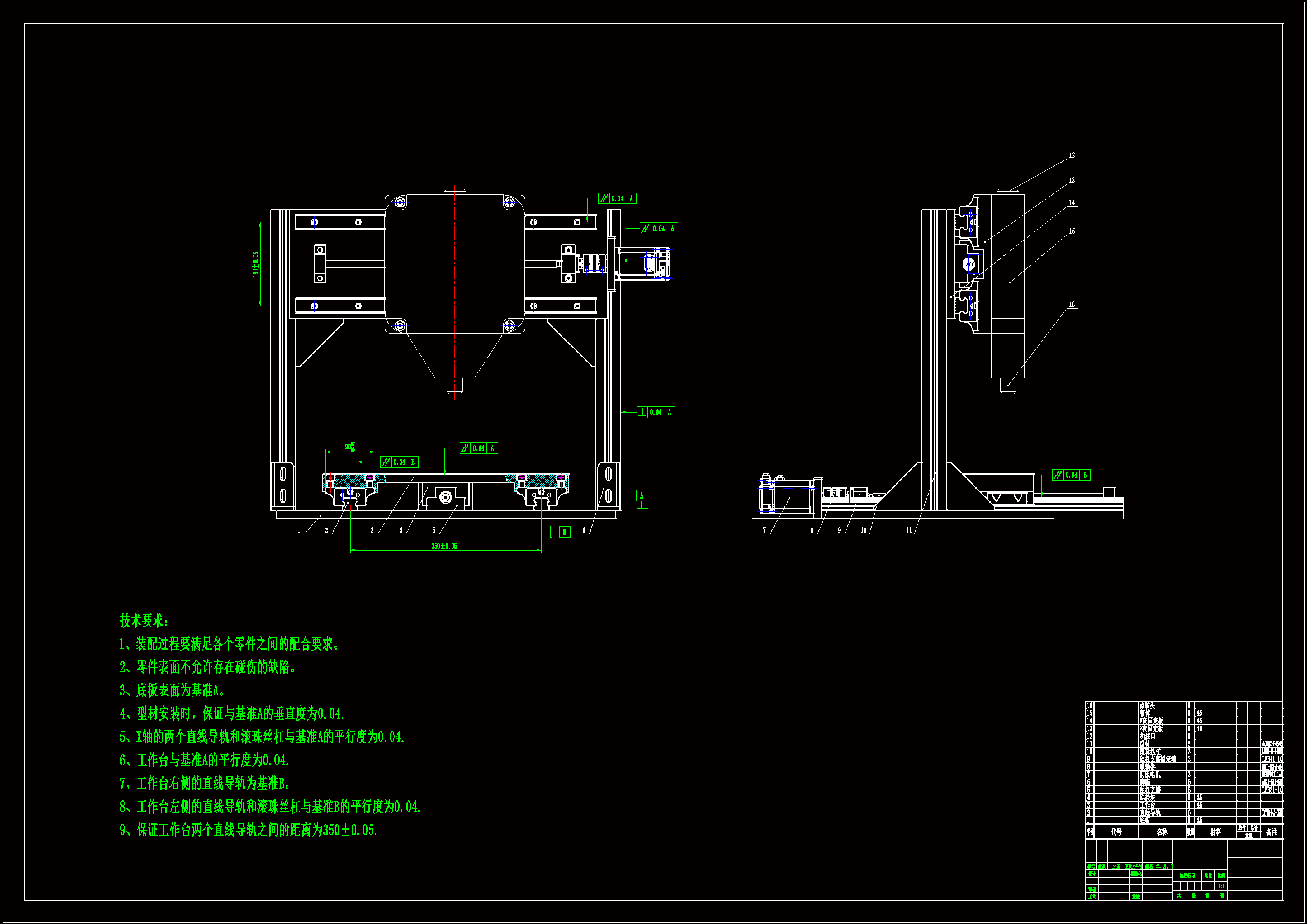 机械部分分为X、Y、Z三个方向,每个方向都做直线运动,共有六个自由度。整个机械结构采用悬臂式结构,Y轴(前后)部分固定在工作台上,Z轴(上下)部分与X轴(左右)部分连接,以悬臂式的形式连接在Y轴上。三个方向的运动是由滚珠丝杠螺母副把电机的圆周运动转化成为直线运动来实现的,到达指定位置后,由点胶控制器控制点胶头完成点胶动作。其中X轴和Y轴方向上要求的运动范围都为500mm,Z轴方向上没有要求运动范围,初步定为300mm。