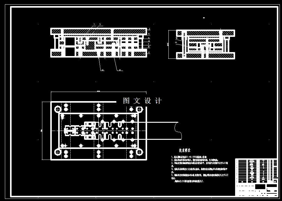 由于该工件既有冲孔落料,又有弯曲工序。首先考虑的是先落料后冲孔再成型的单工序模。结构单一,加工简单,但是由于效率太低生产成本高就放弃了。后来想设计成落料冲孔连续模,当设计冲孔落料模具时,如果设计成连续模的话,因工件尺寸过小,导致连续模最小壁厚过小,不符合资料1表3-27的设计要求,所以最终只能设计成冲孔落料成型的连续级进模,同一个模具上可以多工位生产,成本降低,缺点加工成本高就,结构复杂。