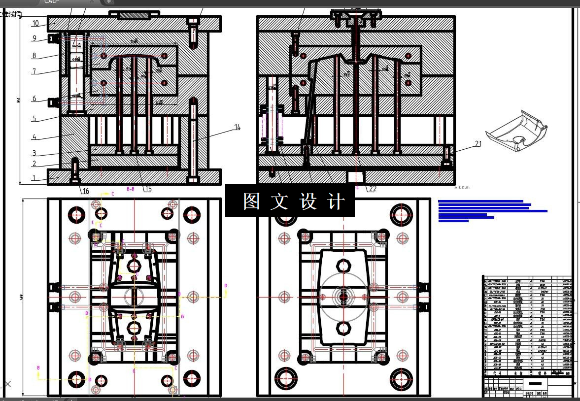 本文主要是设计外壳的注射模具,首先对塑件的材料、结构、表面质量进行分析,然后,论述了注射成型的基本原理,特别是单分型面注射模具的结构设计,详细介绍了注射模具的成型工艺及设备选择、浇注系统、抽芯机构和成型零部件的设计过程,并对模具制造工艺要求做了说明,最后通过CAD软件绘制出模具图。通过本设计,可以对注射模具有一个初步的认识,注意到设计中的细节问题,了解模具结构及工作原理,系统的复习了大学三年所学的专业知识。
