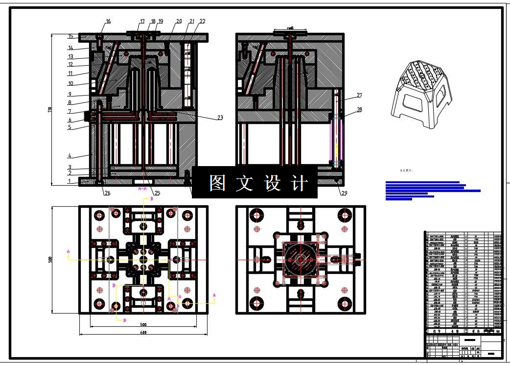 在对塑料凳子的模具设计过程中,本设计主要设计要点如下:塑件的设计比较的合理;分型面的选择有利于塑件成型;脱模机构的设计不但结构简单,而且脱模动作稳定可靠;进浇口的选择不影响塑件外观,而且保证塑件充填均匀;冷却水道的设计使模具效率达到最高,保证塑件质量要求;在设计的过程中借用分析软件如CAD等使设计更合理、更有效;大量使用标准件,使模具制作成本大大降低;本模具设计最关键的一点就是设计已达到实际生产的要求。