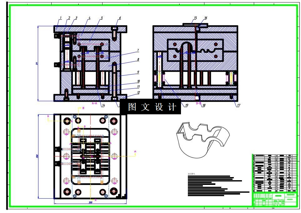 模具结构紧凑、工作可靠、操作方便、运转平稳、冷却效果好、劳动强度低、生产效率高、生产的塑件精度高、生产成本低。本文从型腔数量和布局的确定、注射机选择、流道的设计、模板及其标准件的选用、冷却系统、成型部件的设计等给出了详细的设计过程。