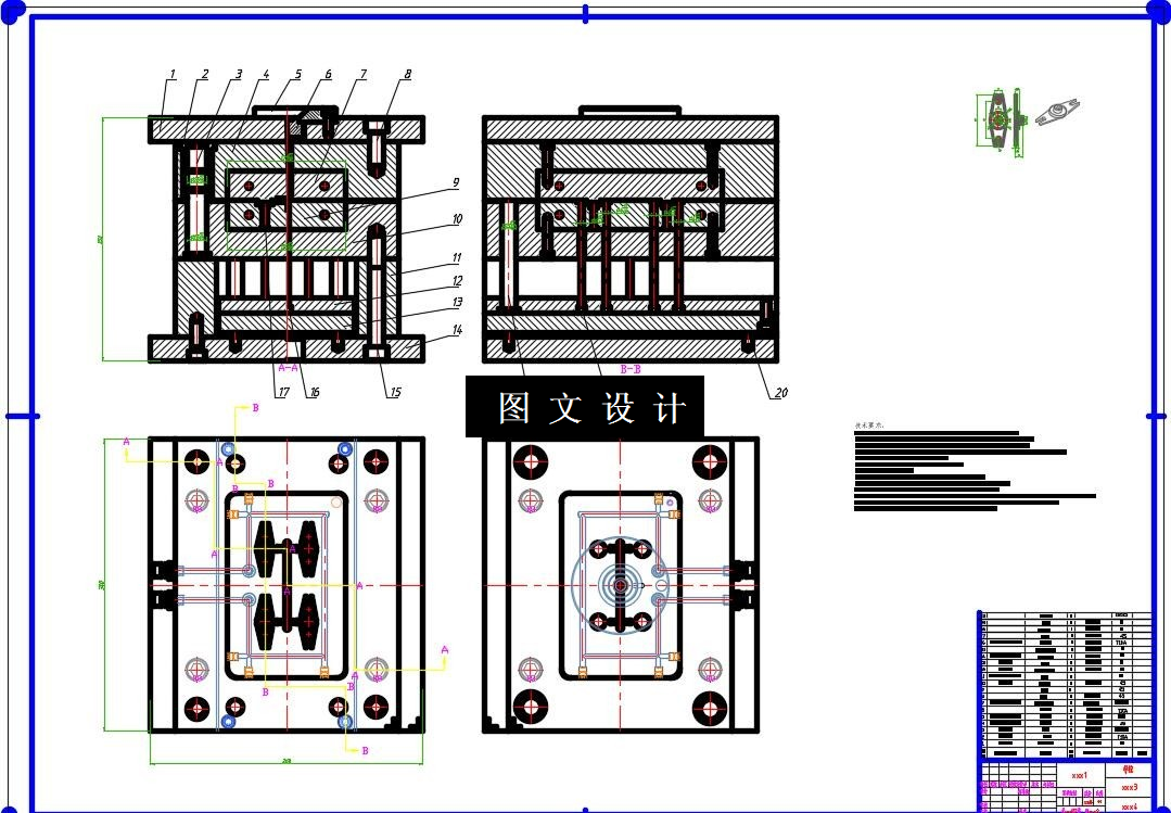 本次的设计是塑料支架的注塑模的设计,依据产品的数量和塑料的工艺性能确定了以1次分型面注塑模的方式进行设计。模具的型腔采用一模4腔直线排列,浇注系统采用侧浇口成形,推出形式为推杆推出机构完成塑件的推出。由于塑件的工艺性能要求注塑模中有冷却系统,因此在模具设计中也进行了设计。本次的设计中参考了大量的文献,还在互联网上查找资料,设计过程比较完整。