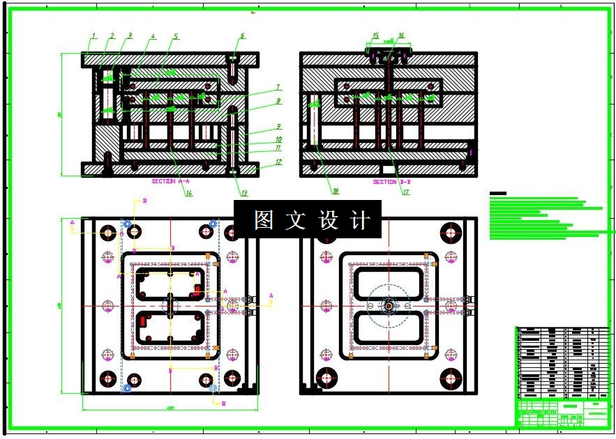 关于此次设计,首先是加热原材料颗粒,等待至完全熔融后,注射进模具,进行冷却和保压,这样, 动模板和定模板在注塑机的拉动下进行张开, 此时,斜导柱带动滑块进行侧向抽芯,当运动到一定距离后,注塑机顶棍会穿过动模座板的孔, 顶棍会抵着推板,推板上的推杆,会将塑件推出,从来来实现循环生产, 推出机构会在复位杆的作用下进行复位,滑块会在合模时,斜导柱的带动下进行复位。