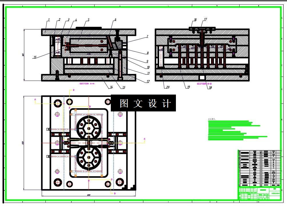 关于此次设计,首先是加热原材料颗粒,等待至完全熔融后,注射进模具,进行冷却和保压,这样, 动模板和定模板在注塑机的拉动下进行张开, 此时,斜导柱带动滑块进行侧向抽芯,当运动到一定距离后,注塑机顶棍会穿过动模座板的孔, 顶棍会抵着推板,推板上的推杆,会将塑件推出,从来来实现循环生产, 推出机构会在复位杆的作用下进行复位,滑块会在合模时,斜导柱的带动下进行复位。