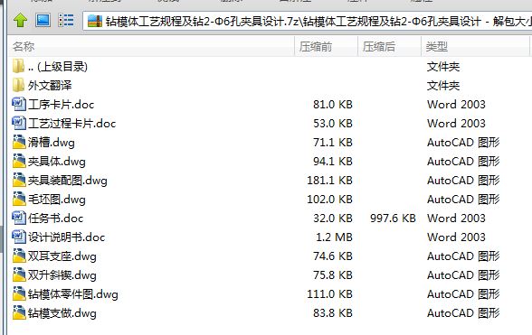 毕业设计(论文)是我们大学中的一次系统、全面的实践学习。在本次设计(论文)中,我所设计的是钻模体工艺规程及钻 2-φ6mm孔夹具设计。合理的工艺规程方案与夹具能保证零件加工的高效率和企业的经济性。我最开始进行资料收集,然后零件分析,再工序设计、接着进行工艺规程设计,最后完成夹具设计。在工艺设计中,我采用几种工艺相对比方法来获得最好的工艺路线,达到节约时间提高劳动生产率的作用。夹具设计是用一面双孔来定位及双升斜锲推动压板夹紧工件。利用这种夹紧装置,钻模体平稳的安装在夹具上,能方便于钻 2-φ6mm孔,也能保证孔的位置精度。综上所述,采用该专用夹具设计方案,保证了零件的大批量的生产,提高了劳动效率。所以,这是可取的。
