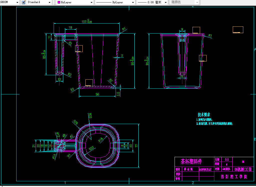 本次设计的茶杯为塑料产品,结构简单,尺寸适中,属薄壁壳体塑件,本产品除了可以当茶具外,用作刷牙杯子也是不错的选择。在当今社会,刷牙基本已成为人们每天必不可少的组成部分,对盛牙膏,牙刷的工具以杯子为主,人们在此方面一般不是很讲究,大部分以塑料杯子为主,就像我所设计的杯子就是人们喜欢的一种。